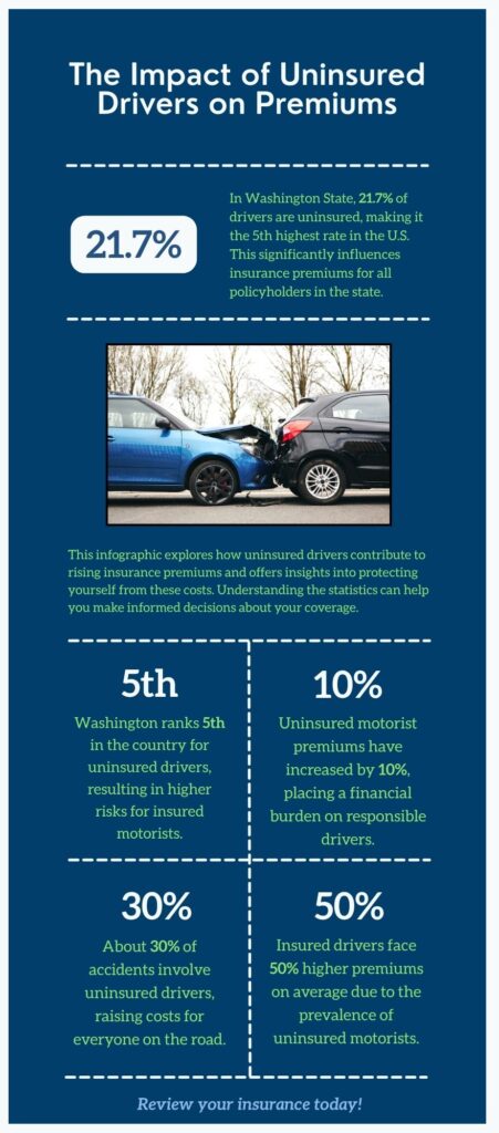 In Washington State, approximately 21.7% of drivers are uninsured, ranking it as the 5th highest state for uninsured drivers. Fortunately, Uninsured Motorist Coverage is available in all states, offering some protection against this issue. However, the increase in uninsured drivers often leads to harsher premiums in areas where this is more prevalent. Understanding how this factor affects your policy is crucial.